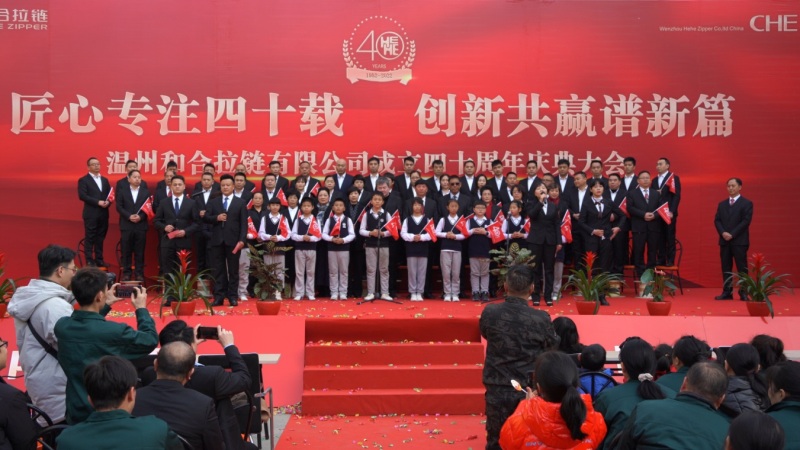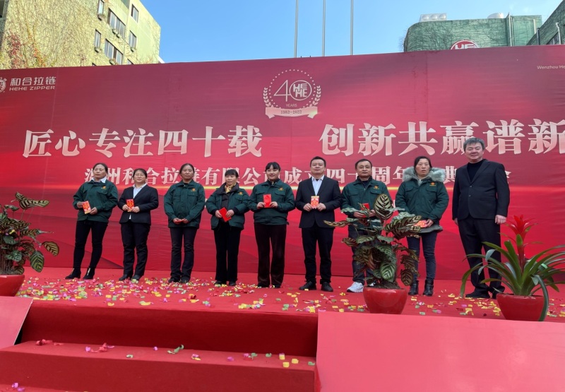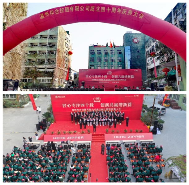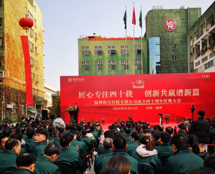 2022年新年元旦,溫州濱海園區(qū)一座綠色廠房內(nèi)張燈結(jié)彩,大紅燈籠高高掛,兩只紅色大氣球載著條幅迎風(fēng)招展,紅紅的拱形門上寫著“溫州和合拉鏈有限公司成立40周年慶典大會”,在冬日暖陽的照耀下,顯得